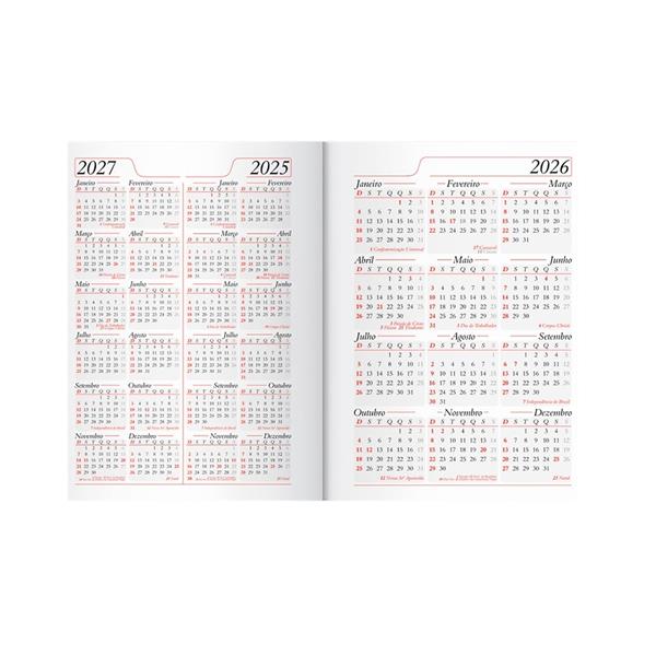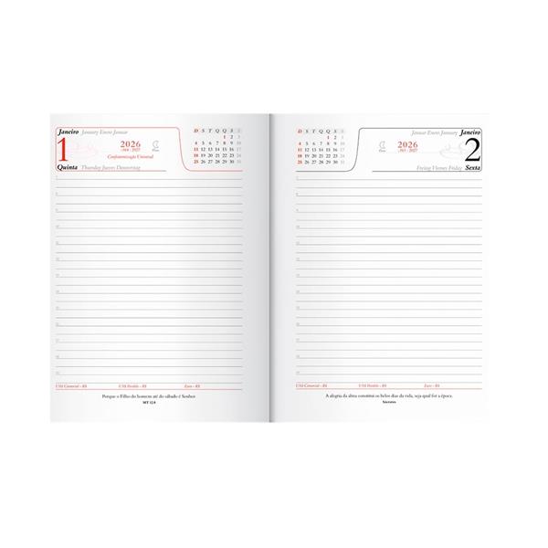 Ref: AGENDA-122Agenda 2026Agenda diária 2026 de couro sintético. Contém fita de cetim marca página, dados pessoais, calendário de 2025 à 2027, mapa do Brasil, mapa-múndi, índice telefônico e planejamento. Altura : 20 cm Largura : 14,7 cm Espessura : 2 cm Peso aproximado (g): 377 PERSONALIZADAQuantidade mínima: 50 Incluir no Orçamento Cores * Azul Quantidade 1 Selecione 50 100 200 300 Quantidade 2 Selecione 50 100 200 300 Quantidade 3 Selecione 50 100 200 300 Informe outra quantidade min. 50 Solicitações adicionais > Incluir No Orçamento